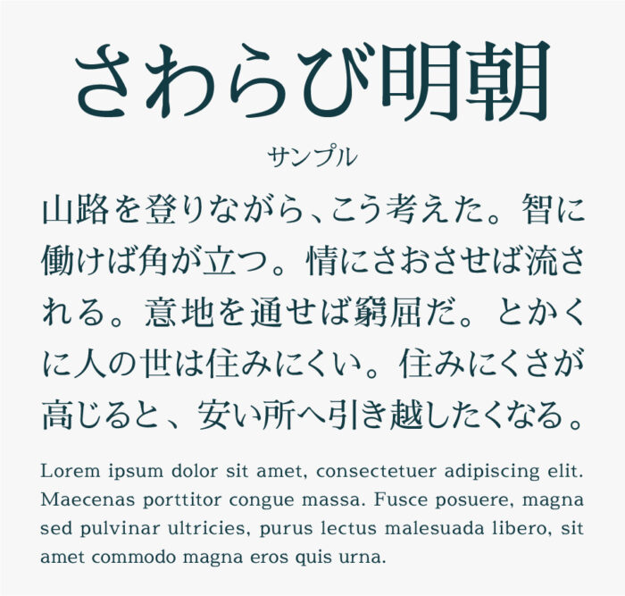 文字の形はさわらび明朝との差はあまり感じられなく、細い筆先で書かれたようなフォントが特徴的です。文字の幅が狭めで柔らかい動きなので、上品でしなやかな印象となっています。品のある・高級感を出したいWebサイトには特におすすめです。フォントウェイトの数も5つあるので、幅広に使うことができます。